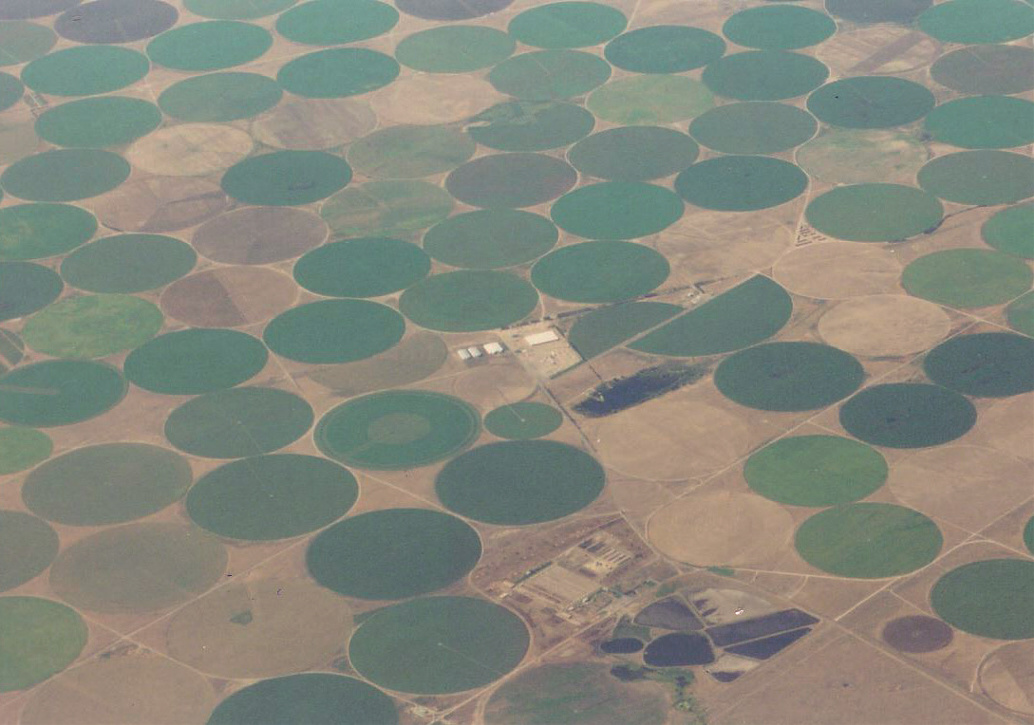 12 km.s højde ses det tydeligt, at vand giver liv, vækst og høst – mens felterne mellem cirklerne dårligt